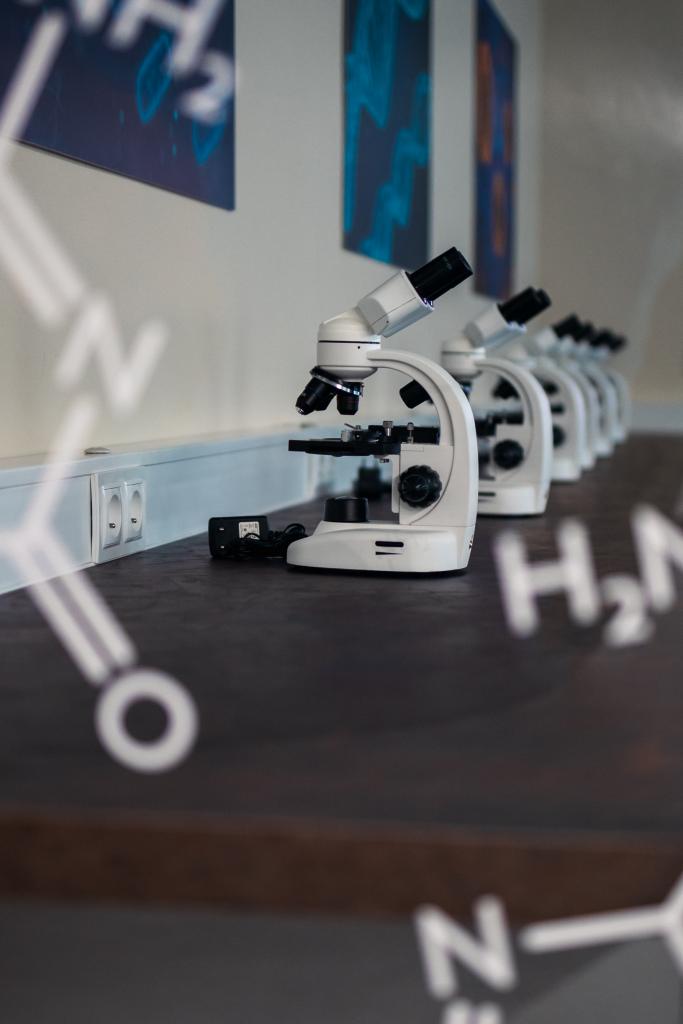 Plně vybavená laboratoř s 12 mikroskopy a 1 profesionálním, který je napojený na obrazovku.